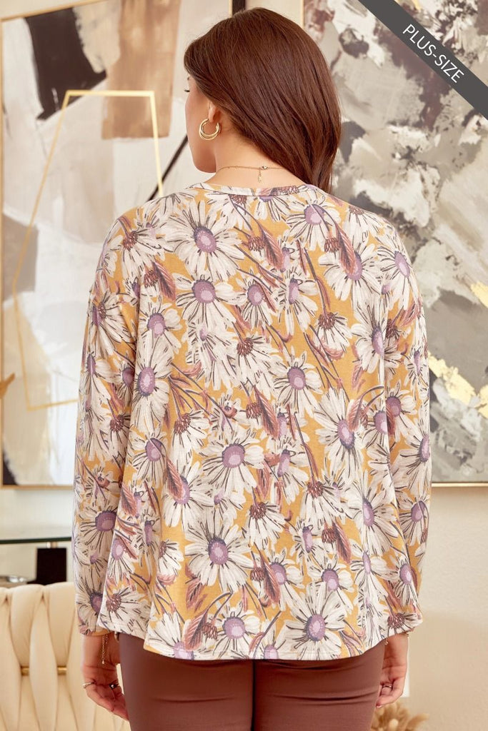 Fun printed pull over with long sleeves and button down detail. Round neckline, flowy fit, knit. Non sheer.