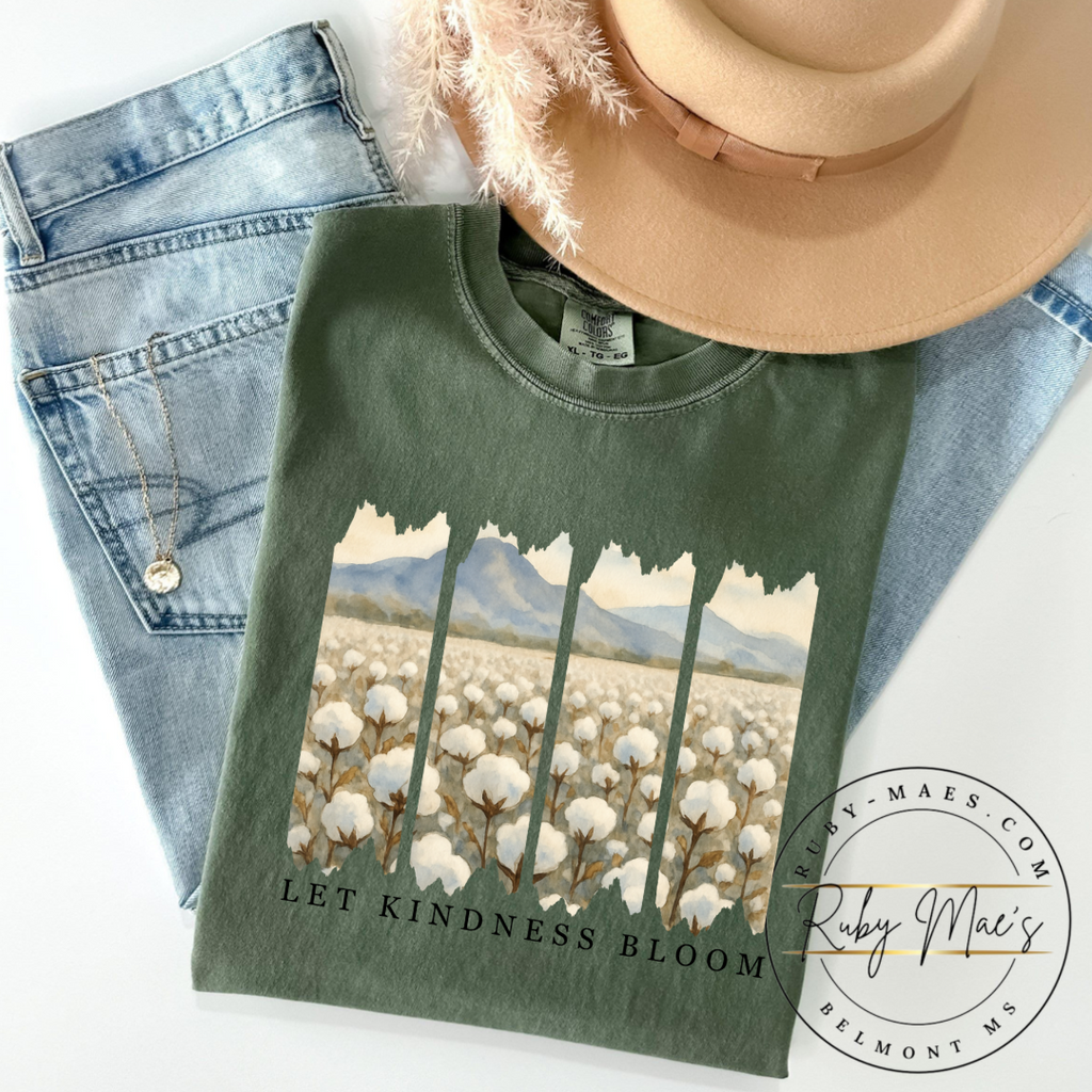 Custom designed watercolor cotton field with “Let Kindness Bloom”